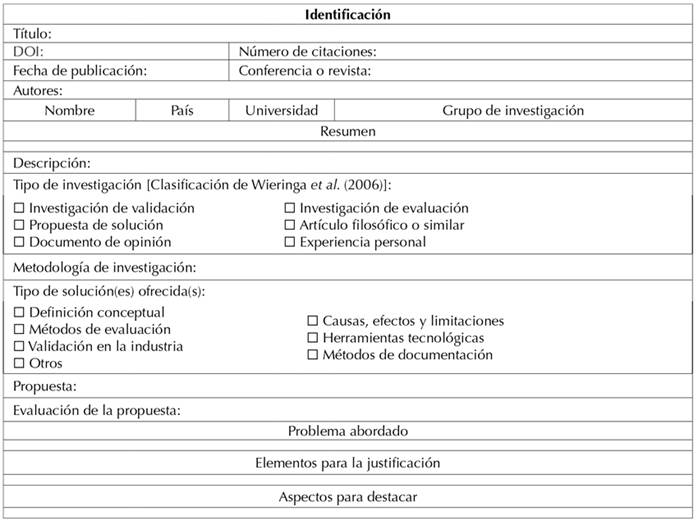 Para realizar una extracción uniforme de la información relevante de los estudios primarios, se definió una ficha con los elementos necesarios para el análisis de los artículos. En la Tabla 3 se presenta la ficha definida para apoyar la estrategia de extracción de datos. Además, esta plantilla facilitó el proceso de análisis en etapas posteriores.