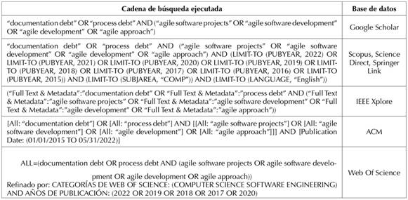El proceso fue llevado a cabo mediante la siguiente cadena de búsqueda: “documentation debt” OR “process debt” AND (“agile software projects” OR “agile software development” OR “agile development” OR “agile approach”), la cual fue adaptada y ejecutada en siete bases de datos científicas: IEEE Xplore, Science Direct, Scopus, Google Scholar, Springer Link, ACM y Web Of Science. Se consideró una ventana de tiempo entre 2015 y mayo de 2022. La búsqueda se inició en 2015 debido a que fue el año cuando se evidencian los primeros trabajos enfocados en DD.