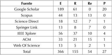 Se realizó una iteración por cada base de datos: Google Scholar, Scopus, Science Direct, Springer Link, IEEE Xplore, ACM y Web Of Science. Sin embargo, cada motor de búsqueda cuenta con su propia parametrización, por lo cual fue necesario adaptar la cadena de búsqueda de acuerdo con estas configuraciones. En la Tabla 4 se presenta la cadena adaptada a cada base de datos.
