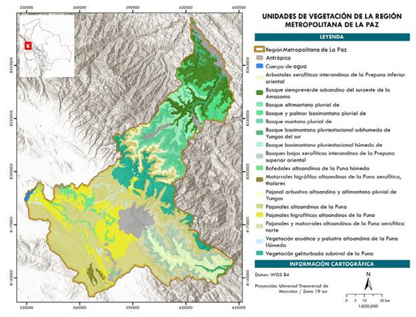 La Paz participó del concurso como región metropolitana, involucrando a ocho municipios: La Paz, El Alto, Viacha, Mecapaca, Laja, Achocalla, Pucarani y Palca. Esta área tiene una extensión de 7284 km2 y una población de 1 840 438 habitantes (GAMLP-UMSA, 2017). Una de sus características sobresalientes es su marcado gradiente altitudinal, que va desde los 400 m en el bosque montano del territorio indígena Lecos de Larecaja hasta los 6450 m en la cima del nevado Illimani. Está conformada por 16 unidades de vegetación altoandina, yungueña y amazónica (Figura 1), en la que habitan una gran variedad de especies de flora y fauna. Esta región cuenta con áreas protegidas municipales dentro de la ciudad de La Paz, y un sector del Parque Nacional y Área Natural de Manejo Integrado (PNANMI) Cotapata se encuentra dentro de la jurisdicción del municipio de La Paz, a tan solo 20 km de la ciudad homónima.