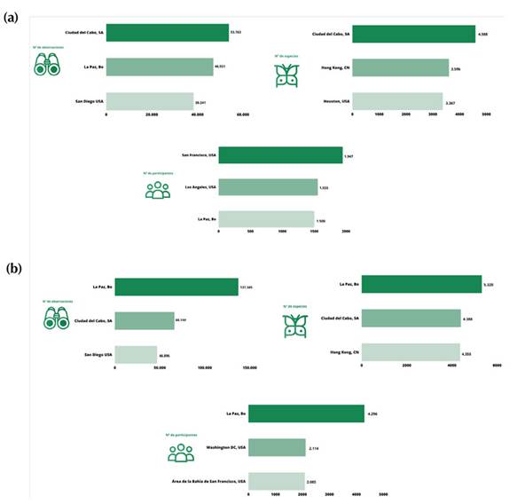 En el concurso internacional CNC, las ciudades participan en tres categorías: 1) mayor número de observaciones, 2) mayor número de especies registradas y 3) mayor número de participantes. El 2019, la región metropolitana de La Paz, en su primer año de concurso, quedó entre los diez primeros lugares en las tres categorías del concurso (entre 159 ciudades). Ocupó el segundo lugar en número de observaciones, el tercer lugar en número de participantes y el octavo lugar en número de especies (Figura 2a). En 2022, lideró en las tres categorías, compitiendo con 445 ciudades. La cantidad de observaciones y participantes fue más del doble que el alcanzado por las urbes que ocupan los segundos lugares en ambas categorías, i.e., Ciudad del Cabo y Washington respectivamente, superando por casi mil especies a la primera, que ocupó el segundo lugar en esa categoría (Figura 2b).