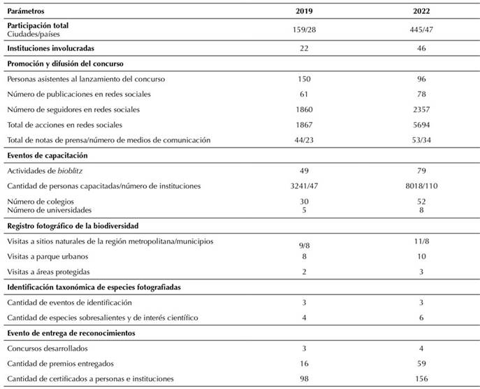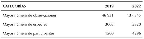 Al comparar los resultados obtenidos en la región metropolitana de La Paz en 2019 y 2022, se observa un incremento significativo en las tres categorías del concurso. El número de observaciones y participantes creció tres veces más con respecto al 2022, y el número de especies fue casi el doble con respecto al 2019 (Tabla 1).