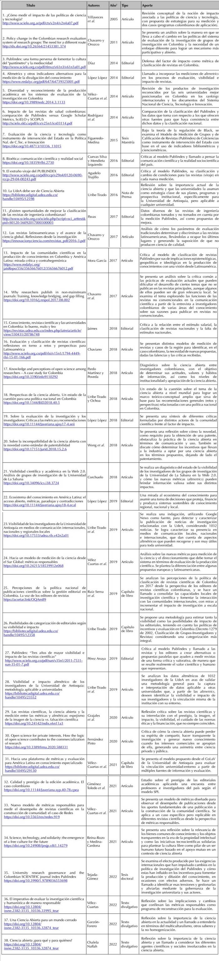 Tras este proceso, y luego de una primera revisión, se llegó a una selección de 77 textos, en los cuales se profundizó para identificar aspectos que pudieran dar cuenta de lo que se ha estudiado en el país en estos temas, de algunas perspectivas a corto, mediano y largo plazo o de cambios necesarios para actualizar la evaluación de la ciencia en el país (Publindex-SCIENTI) desde la perspectiva de la ciencia abierta, las métricas de nueva generación y las métricas responsables.