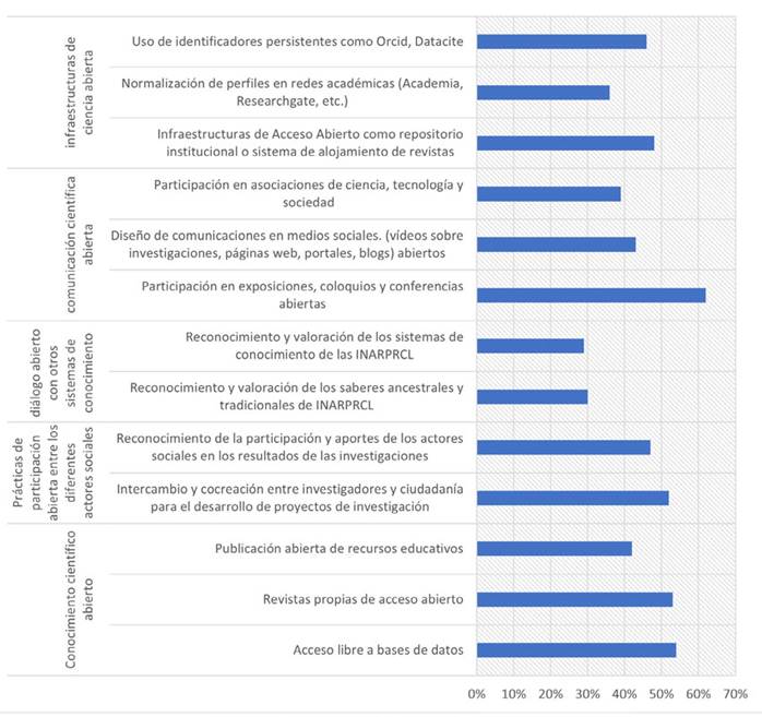 En cuanto a las prácticas relacionadas con la formación de los científicos de todas las áreas, el 53 % nunca ha recibido formación y capacitación en ciencia abierta y el 45 % ocasionalmente ha elaborado recursos educativos abiertos tales como cursos en línea o publicación de libros de texto en abierto. Sobre las prácticas institucionales, el 42 % ha realizado publicación abierta de recursos educativos.