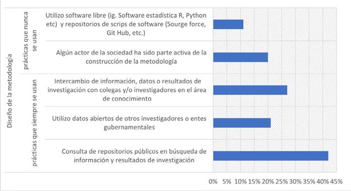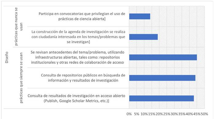 Se destacan algunas prácticas habituales de ciencia abierta que generalmente no se aplican en cada una de las etapas del proceso de investigación (i.e., diseño, metodología, desarrollo y comunicación). Por ejemplo, se encontró que en el diseño de la investigación (Figura 2) se implementan siempre la consulta de resultados de investigación en acceso abierto (Publish, Google Scholar Metrics, etc.) (43 %), la consulta de repositorios públicos para la búsqueda de información y resultados de investigación (44 %) y la revisión de antecedentes del tema/problema utilizando infraestructuras abiertas como repositorios institucionales y otras redes de colaboración de acceso (45 %).