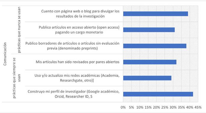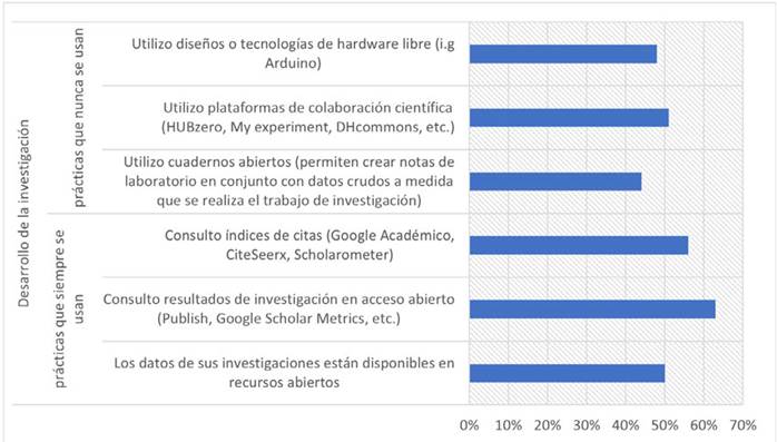 Así, se encontró que, en el desarrollo de la investigación (Figura 4), las prácticas que siempre se realizan son asegurar la disponibilidad de los datos en recursos abiertos (50 %), consultar resultados de investigación en acceso abierto (Publish, Google Scholar Metrics, etc.) (63 %) y consultar índices de citas (Google Académico, CiteSeerx, Scholarometer) (56 %). Las prácticas que no se han adoptado son el uso de cuadernos abiertos (que permiten crear notas de laboratorio en conjunto con datos crudos a medida que se realiza el trabajo de investigación) (44 %), el uso de plataformas de colaboración científica (HUBzero, My experiment, DHcommons, etc.) (51 %) y el diseño o el uso de tecnología de hardware libre (e.g., Arduino) (48 %).