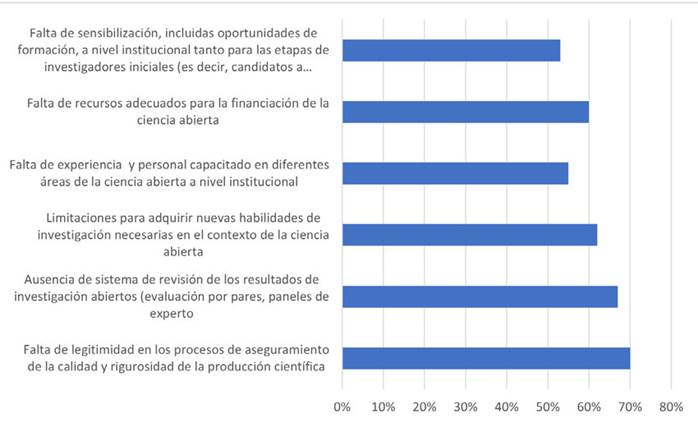 Tampoco se considera que haya obstáculos en términos de calidad, evaluación o recursos. El 70 % de los investigadores del área de educación no creen que exista una falta de legitimidad en los procesos de aseguramiento de la calidad y rigurosidad de la producción científica. El 67 % mencionó la ausencia de un sistema de revisión de los resultados de investigación abiertos (evaluación por pares, paneles de expertos), y el 60 % habló de la falta de recursos adecuados para financiar la ciencia abierta. Esto puede estar relacionado con el número de revistas indexadas en el campo de educación (1870) en el Directorio de Revistas de Acceso Abierto (DOAJ, 2023).