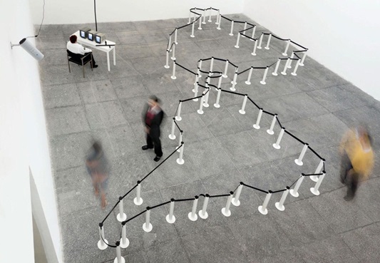 Tal polígono evidencia, de maneira instantânea ao observador da imagem, a representação dos limites territoriais do continente americano (Américas do Norte, Central e do Sul). Como um mapa, a perspectiva inclinada da figura 1 favorece a percepção de que se trata de uma representação do continente americano. O visitante da exposição, por sua vez, teria uma visão mais horizontal, por se situar no mesmo plano que a obra. Logo em seguida o observador percebe que as fitas pretas sustentadas pelos postes brancos são, na verdade, divisórias tipicamente utilizadas para delimitar o fluxo de pessoas em ambientes, tais como filas de espera em aeroportos, bancos, museus, parques de diversão e repartições públicas. As divisórias, no entanto, não possuem abertura para que o visitante da exposição possa entrar no continente. Muito pelo contrário: o artista explicitamente fecha e cerca as fronteiras da obra, obrigando o visitante a circular por fora da divisória. Além de ser impedido de atravessar os limites desse território demarcado pelo artista, o visitante é submetido ao olhar vigilante dos agentes de segurança: um deles (uniformizado e armado de um cassetete), monitora as imagens que são registradas pela câmera, apontada para o continente. O outro permanece de pé, de costas para a obra, com os braços cruzados à frente do corpo, observando a entrada da sala.