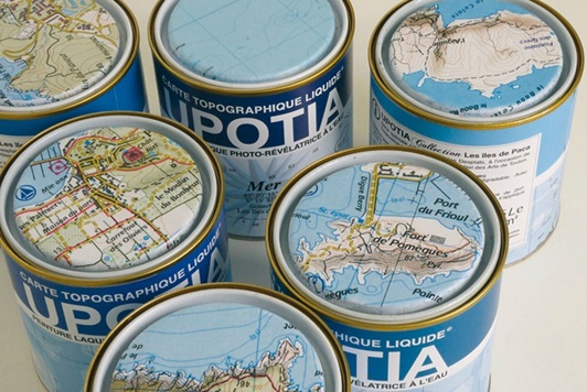 A figura 2 ilustra a obra Upotia, criada pelo artista Nicolas Desplats. Trata-se de seis potes fechados. Cada pote contém um rótulo que cobre toda a sua superfície lateral, contendo o título da obra, em caracteres grandes, como também uma série de outros textos explicativos. As tampas de cada pote exibem imagens de mapas, diferentes entre si, onde é possível perceber típicos elementos da cartografia, como as linhas dos meridianos e dos paralelos, curvas de nível, estradas, nomes de cidades, legendas e fronteiras. Os potes aparentam estar bem fechados e intactos, não demonstrando qualquer sinal de que foram abertos.