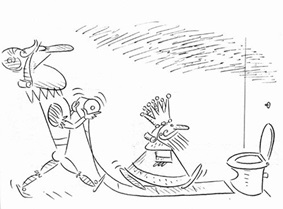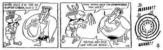 Os cartunistas daquele período expressavam em seus trabalhos o anseio de liberdade e a crítica aos poderosos. Esse conteúdo também é encontrado nos cartuns elaborados por Canini. A soberba e a solenidade dos que detêm o poder são o mote utilizado por ele nos exemplos abaixo (Figuras 8 e 9). Na primeira (Figura 8), o rei se dirige ao vaso sanitário acompanhado pelo vassalo, que utiliza o papel higiênico como se fosse um tapete vermelho. Já o segundo quadrinho (Figura 9) mostra um militar, cujo uniforme está tão cheio de medalhas que precisa usar o peito do subalterno, de estatura inferior, que o segue. A placa com a palavra “Continua” indica essa sequência de condecorações no segundo personagem, igualmente orgulhoso – ambos andam com os olhos fechados para a realidade que os cerca, mas certos de sua grandeza, representada pelas comendas que carregam.