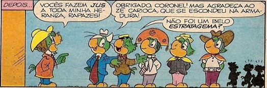 Nessas narrativas estão presentes, de forma sutil, problemas enfrentados pela população, a exemplo de ônibus lotados e falta de água, como “Quanto mais quente, pior”, publicada em 1972: em um dia muito quente, Zé Carioca precisa procurar alternativas para se refrescar, uma vez que de seu chuveiro saem apenas algumas gotas. Esse enredo contrastava com a ideia de que o Brasil era um “país que vai pra frente”, propagada nos meios de comunicação da época pelo governo militar, de acordo com Santos (2002, p. 292). Da mesma forma que o país se encontrava endividado com os bancos estrangeiros, o papagaio vive sendo perseguido pelos cobradores, que até se organizam em uma associação nacional, a Anacozeca, para tentar receber o dinheiro devido.