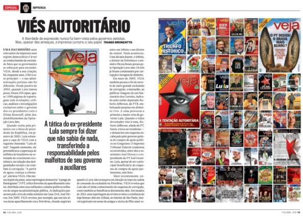 Tendo mostrado o lugar de fala de Veja, isto é, de uma revista de jornalismo imersa em um contexto financeiro, social e comercial bem demarcado, passa-se, no próximo item, à análise da estratégia de autorreferencialidade no seu discurso. A matéria analisada, de título “Viés autoritário”, é assinada por Thiago Bronzatto[7] e é a 12ª na ordem das matérias pertencentes ao rótulo “Especial”, aparecendo nas páginas 72 a 75 da revista. A matéria pertence à edição de 11 de abril de 2018, que é referente à ordem de prisão emitida a Lula.