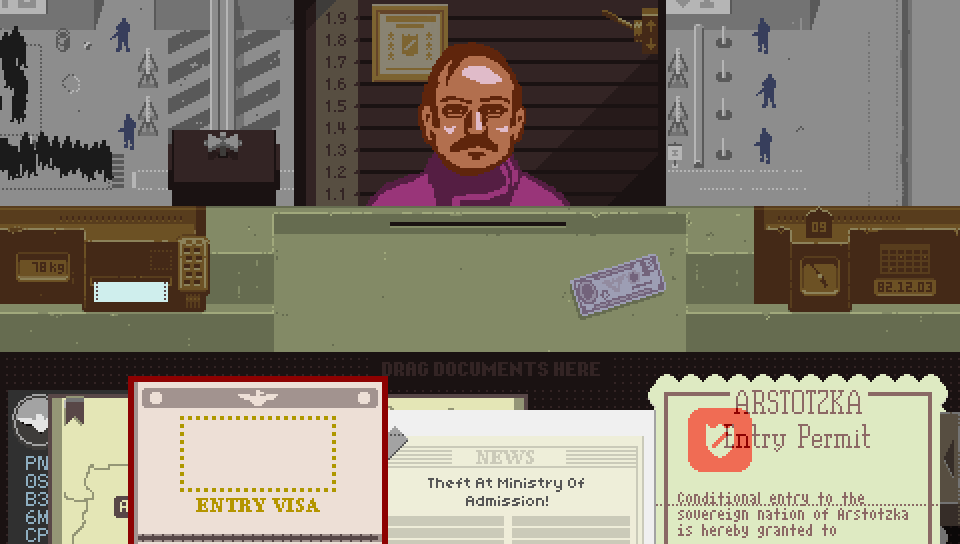 Como um exemplo que foge de temáticas tradicionais de games, mas que também se vale da estética retrô para compor sua interface, temos o jogo Papers, please lançado de maneira independente pelo game designer Lucas Pope em 2013. Neste game lançado para Playstation 4, PC e plataformas mobile (smartphones e tablets), o jogador faz o papel de um fiscal de fronteiras na república fictícia de Arstotzka. É preciso tomar decisões morais sobre deixar ou não os cidadãos cruzarem a borda para entrar no outro país. Vale destacar que o visual do game replica dos jogos da década de 1990, mas a interface possui a complexidade dos jogos atuais de computador e console.