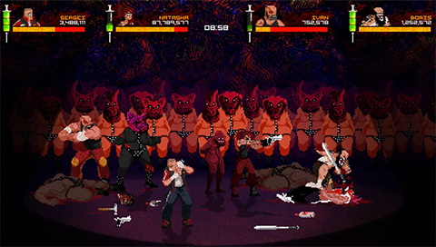 O último exemplo que trazemos para esta discussão é o game Mother Russia bleeds da produtora Devolver Digital, disponibilizado no mercado em 2016. A narrativa, ambientada em uma Rússia apocalíptica, é um jogo de luta que reproduz os gráficos e mecânicas de jogos como Double Dragon (Technōs Japan), de 1987. Logicamente, como no supracitado Shovel Knight, há uma atualização de possibilidades narrativas e mecânicas em Mother Russia bleeds, mas uma atualização que vem “envelopada” por uma aura retrô que serve como um diferencial para o game.