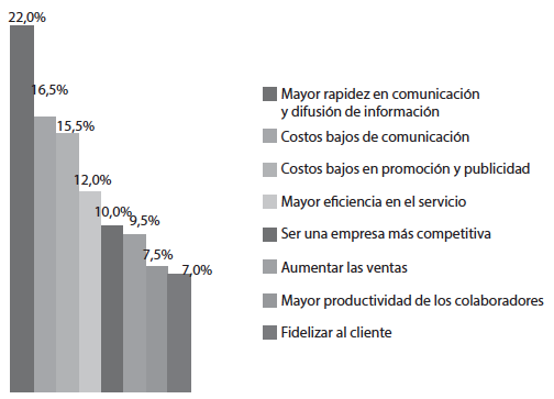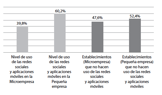 En el ámbito de cobertura, el 9,9% más de establecimientos de la pequeña empresa tiene acceso a internet en relación con la microempresa. La acogida por las redes sociales, es mayor en 7,8% en correspondencia con la microempresa. No obstante existe un nivel bajo en la microempresa y medio en la pequeña empresa en adopción de redes sociales.