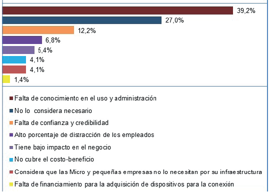 El 60,2% de establecimientos no hacen uso de las redes sociales. Tras evaluar las razones aducidas, se han tipificado los siguientes aspectos, los mismos que se ilustran en el gráfico 3, demostrando que las principales razones son por: a) Falta de conocimiento en el uso y administración, b) No lo considera necesario, c) Falta de confianza y credibilidad.