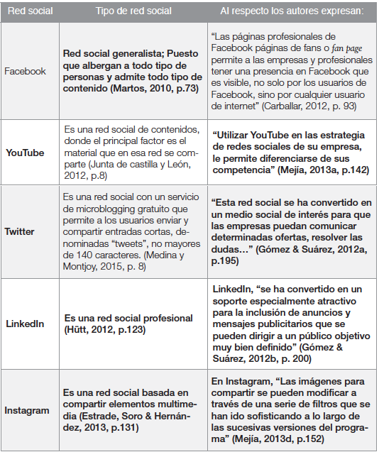 En este escenario las redes sociales para la empresa según la conectividad, acorde a Ureña y Valenzuela “representan potenciales repositorios de información” (2011, pp. 131, 132). Ante estas circunstancias, los negocios están expuestos a este nuevo sistema de comunicación, pues según Valls (2016, p. 24), la empresa “requiere de estrategias comunicativas nuevas que aprecien estos cambios sociales, se adapten al nuevo entorno y le den más importancia a la comunicación”, aunque es preciso hacer hincapié en los diferentes tipos de redes sociales que tienen mayor impacto en las empresas y la sociedad, las mismas que se ilustran en la tabla 1, incluyendo el criterio de algunos autores al respecto.