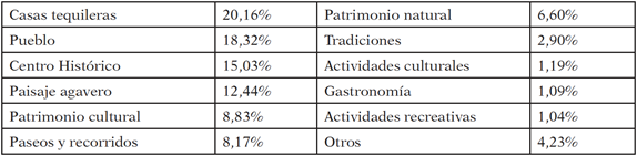 El pilar privado viene definido por el ecosistema de emprendimiento privado, formado por las empresas tequileras y los centros de investigación que fomentan la eficiencia y la productividad de la industria manufacturera de Tequila (CIATEJ, 2004). De hecho, esta industria en Tequila (tabla 2) representa el 97% del valor de la producción de las empresas tequileras (Plan Municipal de Desarrollo 2015-2018, p. 75), a lo que se unen pequeñas microempresas y cooperativas que ofrecen al mercado productos derivados del tequila, como la miel de agave, y las artesanías realizadas con motivos tequileros (barricas de madera para almacenar tequila, pirograbado en madera y vasos de tequila («caballitos») realizados por cincuenta familias del municipio integradas en las dos cooperativas de artesanos existentes en Tequila. Todo ello hace que haya una fuerte diversificación en los motivos para realizar una visita turística a la villa de Tequila, tal y como se muestra en la tabla 3.
