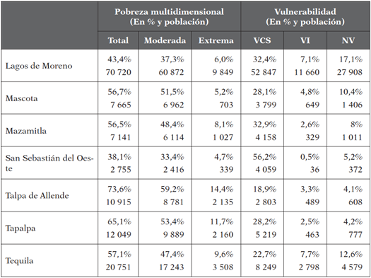 Según se observa en la Tabla 4, los altos niveles de pobreza multidimensional existentes en los pueblos mágicos, que oscilan entre un 38,1% en San Sebastián del Oeste y un 73,6% en Talpa de Allende siendo el 57,1% en Tequila, lleva a que no hayan sido tan positivos los resultados esperados tras la implantación de los planes estatales de lucha contra la pobreza. Esta situación también se da en términos de pobreza extrema, que oscila en estos municipios entre un 14,4% en Talpa de Allende y un 4,7% en San Sebastián del Oeste, y que viene relacionada con un bajo (e incluso inexistente) nivel educativo y la realización de trabajos basados en la informalidad con sueldos muy bajos y sin ningún tipo de cobertura y protección sanitaria.