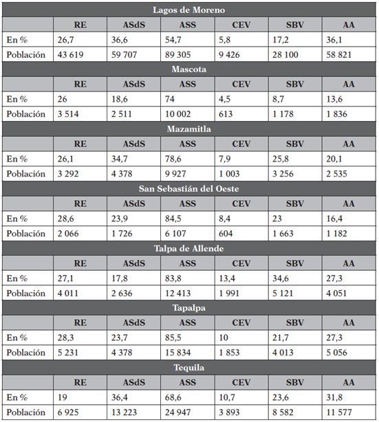 Así, en lo que respecta al rezago educativo, que oscila entre el 19% de Tequila y el 28,6% de San Sebastián del Oeste, viene definido por la no finalización de los estudios básicos debido, principalmente, a la necesidad de trabajar (generalmente de forma ilegal) a edades tempranas, situación que también se da en México porque, según datos de la Secretaría de Educación Pública (SEP) para el curso académico 2016-2017, la tasa neta de escolarización para la Educación Preescolar (de 3 a 5 años de edad) fue del 62,3%, para la Educación Primaria (de 6 a 11 años de edad) del 97,5%, en la Educación Secundaria (de 12 a 14 años de edad) alcanzó el 86,2% y en la Educación Media Superior (de 15 a 17 años de edad) llegó al 57,2% y únicamente al 29,8% para la Educación Superior (de 18 a 22 años de edad) (SEP, 2017). El hecho de que apenas algo más de la mitad de la población mexicana esté escolarizada desde los 15 hasta los 17 años de edad perjudica el desarrollo económico de la nación azteca a medio y largo plazo y tiende a agravar las desigualdades sociales dentro de México. Por ello, la mejora en la calidad educativa lleva a una generación de empleo que actúa como una condición necesaria pero no suficiente para lograr cambios importantes en la distribución del ingreso y lograr una mayor permeabilidad entre los distintos estratos sociales existentes en México (Perticara, 2012).