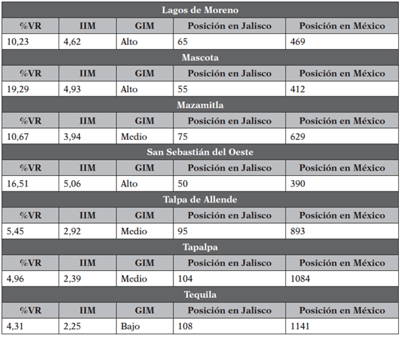 Aunque el GIM de Tequila es considerado bajo con un índice de intensidad migratoria (IIM) de 2,25, esta situación contrasta con los GIM calificados como altos obtenidos en San Sebastián del Oeste (IIM = 5,06), Mascota (IIM = 4,93) y Lagos de Moreno (IIM = 4,62). Estos elevados índices hacen pensar en que los ingresos generados por el turismo son insuficientes en estos municipios, a pesar de las atracciones turísticas existentes en ellos, principalmente, entre otras, las minas de plata en San Sebastián del Oeste, el Museo Regional de Arqueología en Mascota y el Centro Histórico de Lagos de Moreno, designado como Patrimonio Mundial por la UNESCO.