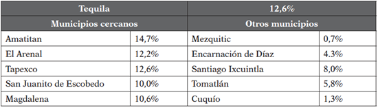 2. La puesta en marcha de una DOT desde 1974 por la Cámara Nacional de la Industria Tequilera (CNIT) y la declaración como Patrimonio Cultural de la UNESCO en 2006 han llevado a proteger en la producción y distribución de tequila a 181 municipios de Guanajuato, Jalisco, Nayarit, Michoacán y Tamaulipas, de los que 125 están en Jalisco (tabla 9).