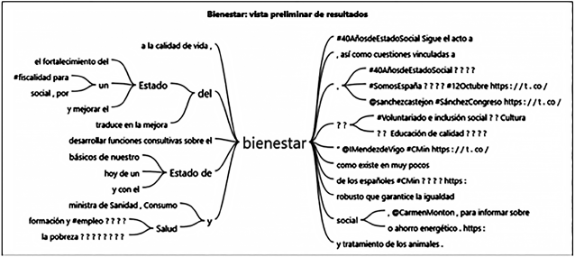 Haciendo especial referencia al ODS 3, «Salud y bienestar», uno de los más destacados e investigados desde un enfoque multidisciplinar, en la Figura 7 se muestra el contexto en el que aparece el término «bienestar» en la cuenta objeto de estudio. Este vocablo aparece con otras palabras como «Estado» o con los hashtags #40AñosdeEstadoSocial o #SomosEspaña, lo que vienen a indicar la preocupación del gobierno por los valores que representa España y por el bienestar de los ciudadanos.