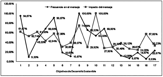 Como se puede comprobar en la figura ut supra reflejada, los mensajes que hablan del ODS 8, es decir, «trabajo decente y crecimiento económico» han sido los que han tenido un mayor impacto, sin embargo, no son los más publicados. Lo contrario ocurre con los mensajes que hablan del objetivo 10, «reducción de las desigualdades», que son los más publicados, pero tienen un impacto del 53.33%. Por otra parte, los mensajes con menos impacto son los que hablan del ODS 15 y 11. En referencia al ODS de «salud y bienestar» (3) destaca que el impacto medio por mensaje es de 61.33%, de lo que se deduce que es uno de los más importantes. Otros objetivos que aparecen con poca frecuencia son el 16 y el 14.