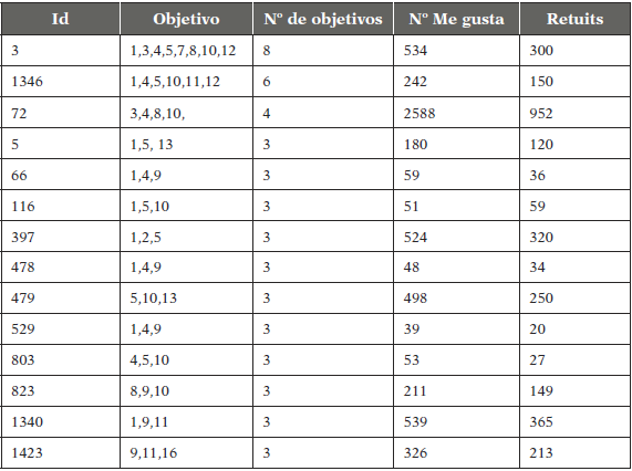 En general, los ODS más publicados por la organización no son los que han causado una mayor reacción en el público. En este sentido, es preciso comentar que la mayor diferencia está en el objetivo 16, «paz justicia e instituciones sólidas» y en el 2, «hambre cero». En ambos la reacción del público ha sido mucho mayor en comparación con el número (n) de mensajes publicados en los que se habla de ellos. Para una visión con más detalle, en la Tabla 3 se observan los mensajes que tratan varios objetivos a la vez, en concreto, se muestran aquellos mensajes que contienen más de tres.