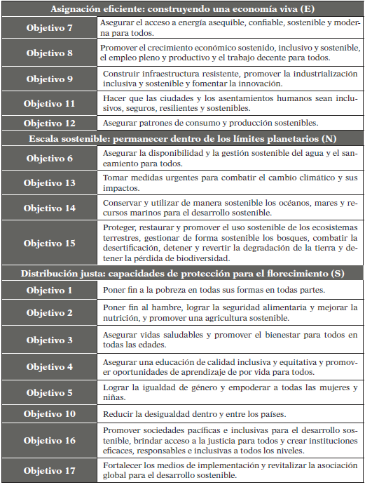 Costanza et al. (2016) han elaborado métodos para relacionar los ODS a las medidas globales de bienestar sostenible. Para ellos, en un mundo interconectado, los ODS no se pueden lograr a menos que haya un bienestar sostenible a escala mundial. Se basan en la idea de que el mejor sistema es aquel cuyo objetivo general se basa en una vida de alta calidad, próspera y equitativa de sus ciudadanos que, a su vez, sea sostenible. En este sentido proponen un nuevo indicador que sea capaz de medir el bienestar y que integre los conocimientos actuales de la ecología, la economía, la psicología y la sociología para ello. Este indicador es el «SWI» (Sustainable Wellbeing Index) que es un híbrido que combina tres partes básicas para un bienestar sostenible desde una dimensión económica, pero incluyendo tanto a la sociedad como la naturaleza. Está compuesto por tres elementos: Contribución Económica Neta (E) o asignación eficiente (elemento económico), Capital Natural / Contribución a los Servicios del Ecosistema (N) o escala sostenible (elemento medioambiental) y Capital Social / Contribución Comunitaria (S) o distribución justa (elemento del bienestar). Además, en su trabajo (op. cit.) relacionan estos tres elementos que forman el indicador de bienestar sostenible (SWI) con los 17 Objetivos de Desarrollo Sostenible (ODS) (ver Tabla 1).