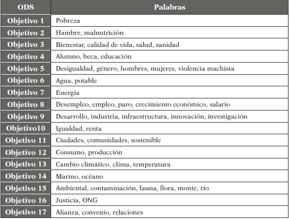 En la segunda etapa se ha procedido a la codificación de dichos posts según tres variables: v1 objetivo (o1...o17), v2 mes (enero…diciembre) y v3 impacto (likes +compartidos). Para codificar los mensajes según la variable 1 se ha tenido en cuenta que estos contengan palabras o expresiones relacionadas con cada ODS (ver Tabla 2). Asimismo, para medir el impacto (variable 3) del mensaje se ha sumado las veces que estos se han compartido más los likes de cada uno.