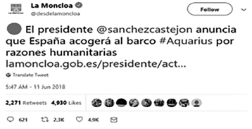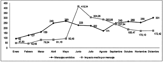 Si se observa la evolución mensual de los mensajes emitidos durante 2018 y el impacto provocado en el público por dichas publicaciones (likes+retweets) se obtienen los datos de la figura 2, que muestra que el mayor impacto medio por mensaje se obtuvo en el mes de junio. En este mes, en la madrugada del sábado 9 de junio al domingo 10, se produjo el rescate por parte del buque Aquarius de 629 inmigrantes que intentaban alcanzar la costa europea, entre los que se encontraban 123 menores no acompañados, 11 niños pequeños y 7 mujeres embarazadas.