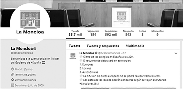 En el análisis de resultados se muestra en primer lugar una descripción general de la cuenta @desdelamoncloa. A continuación, los datos del análisis cualitativo y por último los resultados correspondientes al análisis cuantitativo. La figura 1 muestra que la cuenta oficial del Gobierno en España sigue a 154 usuarios y cuenta con 591.769 seguidores. Estos datos ofrecen una visión de la personalidad de la cuenta, medida por el ratio TFF (Twitter Following Follower Ratio) (Moll, 2015). En el caso que nos ocupa, al ser la cuenta analizada una institución pública de reconocido prestigio, el valor del ratio es muy elevado (591.769/154), lo que significa que resulta difícil transmitir una sensación de cercanía.