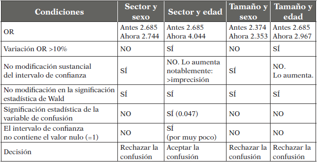 Una vez tratada la interacción, se procede a estudiar la posibilidad de confusión entre las variables de control. Tras valorar el conjunto de recomendaciones que dan los expertos (Aguayo & Lora, 2007) para tomar una decisión al respecto (tabla 6) se concluye que la variable Edad produce confusión en la de Sector, por lo que se incluirá en el modelo a tratar.