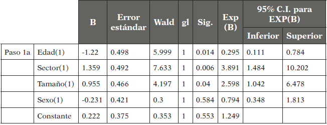 En la tabla 7 se muestran los principales indicadores que evalúan la bondad de un ajuste realizado por regresión logística. A pesar de que ninguna de las propuestas crea un modelo que cumpla la totalidad de los mismos, es el tercero, es decir, una vez que, a las variables de control de partida, Sector y Tamaño, se les añade la que interactúa con Tamaño (Sexo) y la que origina confusión con Sector (Edad), el que más se aproxima.
