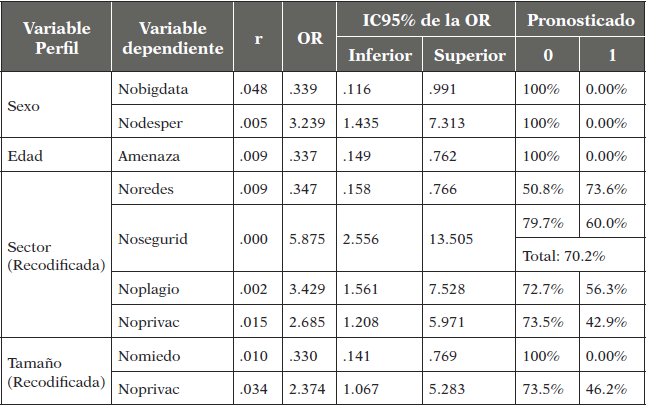 Para las dependientes: NOBIGDATA, en cuanto al Sexo, AMENAZA, en cuanto a Edad, NOREDES, en relación al Sector y NOMIEDO, en lo que respecta a Tamaño, sus márgenes inferiores y superiores, al no alcanzar la unidad, indican una reducción de la fuerza o posibilidad de las asociaciones que se están estudiando.