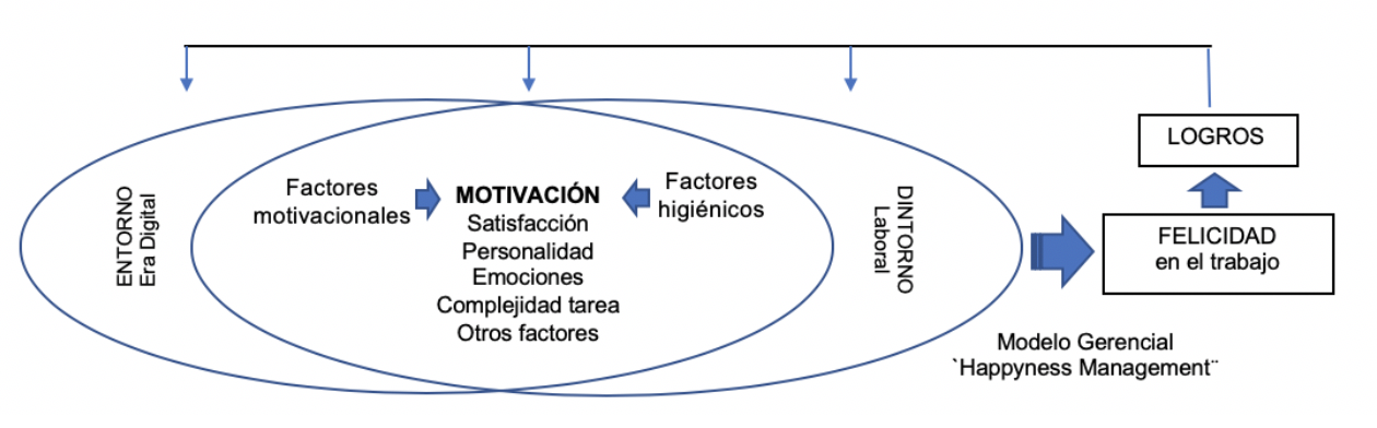 Felicidad, satisfacción y motivación son términos distintos, pero claramente interrelacionados. La Real Academia de la Lengua Española (RAE) define la motivación como el estímulo o interés que determina en parte las acciones de una persona. Y, así, que el empleado se encuentre motivado a realizar su trabajo y a lograr los objetivos fijados, podría considerarse tanto una finalidad (Price & Reichert, 2017; Taipale et al., 2011; Baptiste, 2007), como un instrumento (Gaitán et al., 2015; Meyers et al., 2013; Zelenski et al., 2008, Chalofsky, 2003 en Arslan & Roudaki, 2019) del «Happiness Management».