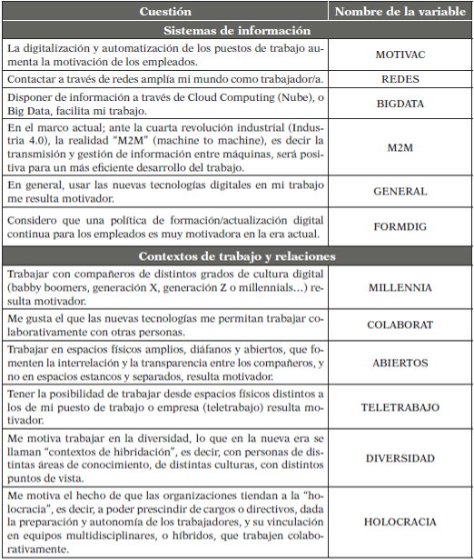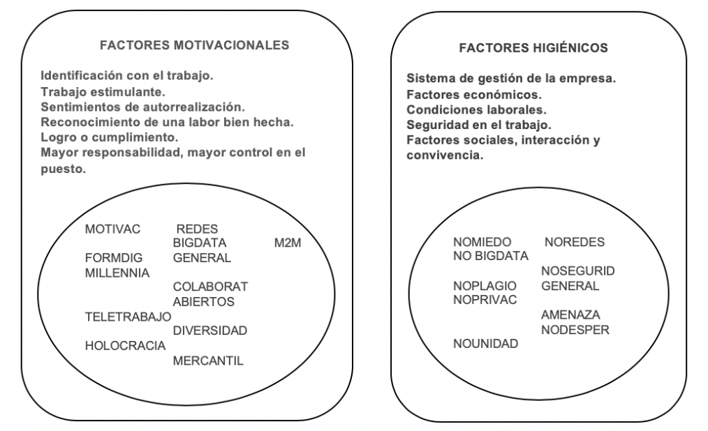 La originalidad de este trabajo radica en que se añaden a los dos grupos de factores tradicionales, tanto motivacionales como higiénicos, algunos de nueva aparición, característicos de la era digital, y que, ineludiblemente, forman, o van a ir formando progresivamente, parte de las condiciones habituales del contexto laboral (figura 2).