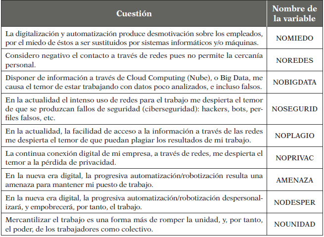 Los calificados como temores a «higienizar» presentan una mayor irregularidad. La posibilidad de trabajar con datos falsos, la falta de cercanía personal que conlleva el comunicarse a través de redes, el miedo a ser sustituidos por sistemas informáticos y máquinas y la despersonalización que puede acarrear la progresiva automatización de las tareas son los más temidos. Los factores relacionados con la falta de seguridad, el plagio, la no privacidad de la información particular, el sentir amenazado el empleo por la progresiva automatización y el riesgo de que la mercantilización de las tareas conlleve la pérdida de unidad del colectivo de trabajadores, muestran medias por debajo de 3. No obstante, un factor común en todos ellos es que también son elevadas sus desviaciones típicas, algunos participantes no los considera en absoluto como cuestión a temer, otorgándoles un 1, mientras que otros les conceden el mayor valor, 5.