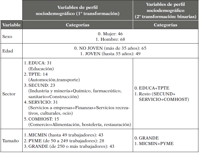 Al participante se le plantea una serie de preguntas para definir su perfil sociodemográfico. Se tratan de variables cualitativas nominales, ya sean de carácter binomial (sexo) o multinomiales (edad, sector y tamaño). Para operar en el análisis de los mismos, se renombran las categorías, y, dado que la muestra apenas supera el centenar de casos, para algunas variables se agregan categorías a fin de que contemplen un mayor número de elementos. En la tabla 3 (1ª transformación) quedan indicadas dichas modificaciones.