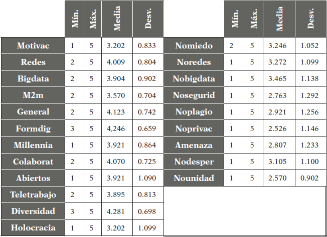 Todos los factores motivacionales propuestos consiguen puntuaciones medias por encima de 3, esto es, son aceptados como tales. Claramente destacan las motivaciones originadas por trabajar en «contextos de hibridación», con personas de distintas áreas de conocimiento, de distintas culturas, con distintos puntos de vista, y por disfrutar de una política formativa continua de actualización digital que la empresa plantee para sus empleados. Sus respectivas desviaciones típicas son las menores de todo el listado (tabla 4).