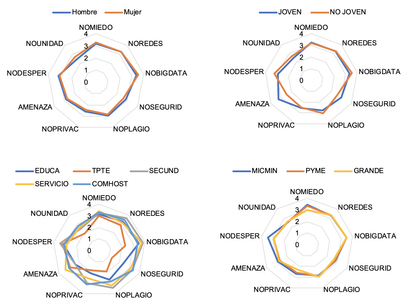 En un primer paso se analizan las medias de las diferentes categorías de cada una de las variables de perfil (figura 3). Se observa que en las categorías de sexo las medias de los diversos factores son similares, prácticamente los perfiles gráficos se superponen. Para las dos edades codificadas, jóvenes y no jóvenes, parece vislumbrarse una clara diferencia en AMENAZA, más percibida por los jóvenes. También se puede comprobar en NOSEGURID, aunque más levemente. La diversidad es mayor en cuanto a las categorías de la variable Sector, donde cabe sospechar de diferencias en NOBIGDATA, NOSEGURID, NOPLAGIO, NOPRIVAC, AMENAZA y NOUNIDAD. Transporte y Educación parecen ser los sectores donde menores son dichos miedos; el sector Secundario y el de Servicios donde más. Con respecto al tamaño de la empresa, las de menos de 50 empleados son donde mayor es el temor medio a NODESPER, y de forma menos evidente en NOMIEDO y NOPRIVAC, junto con las PYME.