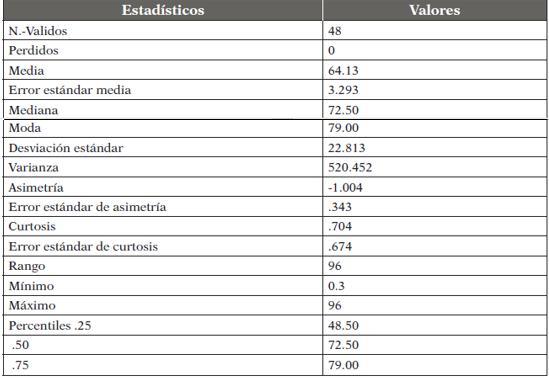 egún se puede observar en la Tabla 7, el promedio de error sobre 48 observaciones es de 64.13 por ciento, con una desviación estándar de 22.813%. Además, se puede apreciar que la mitad de los emprendimientos tuvieron un porcentaje de error en sus pronósticos menores al 72.50%. 79 fue el porcentaje de error más frecuente en una escala de 1-100 por ciento; mientras que la diferencia entre el porcentaje mínimo y máximo de error del pronóstico fue 96 por ciento, y el 50% de los emprendimientos tuvieron un error en sus pronósticos entre 48.50% y 79%. La distribución es asimétrica negativa, es decir la mayor cantidad de datos se encuentran agrupados a la derecha y tiene una curtosis leptocúrtica, por consiguiente, existen mayor cantidad de datos en la región central, identificando con ello que los datos rodean en gran medida el 64.13% de error del pronóstico