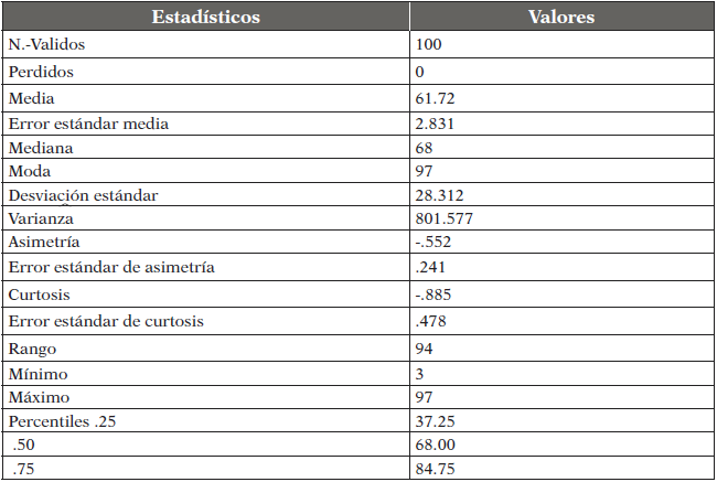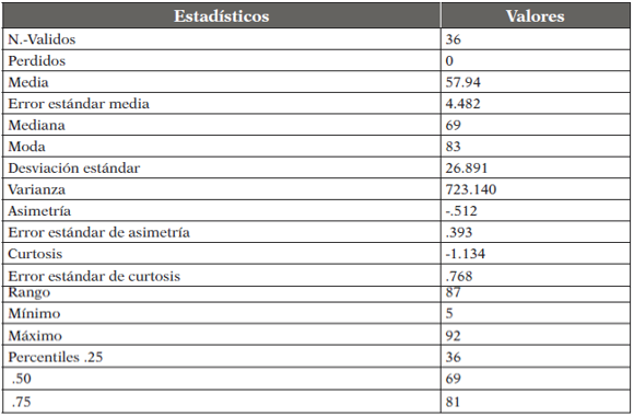Según los estadísticos descriptivos que se presentan en la Tabla 6, el promedio de error sobre 100 observaciones es de 61.72%, con una desviación estándar de 28.312%. Además, se puede apreciar que la mitad de los emprendimientos tuvieron un porcentaje de error en sus pronósticos menores al 68%, mientras que 97% fue el porcentaje de error más frecuente en una escala de 1-100 por ciento, la diferencia entre el porcentaje mínimo y máximo de error del pronóstico fue 94%, y el 50 por ciento de los emprendimientos tuvieron un error en sus pronósticos entre 37.25% y 88.75%. La distribución es asimétrica negativa, es decir la mayor cantidad de datos se encuentran agrupados a la derecha y tiene una curtosis platicúrtica, lo que significa que existe muy poca agrupación de datos en la región central, pudiendo identificar que los datos presentan gran variabilidad o dispersión en relación a su media.