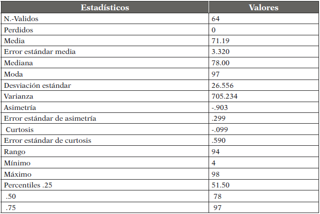 Según los estadígrafos de la Tabla 9, el promedio de error sobre 64 observaciones es de 71.19 por ciento, con una desviación estándar de 26.55%. Además, se puede apreciar que la mitad de los emprendimientos tuvieron un porcentaje de error en sus pronósticos menores al 78%. 97 fue el porcentaje de error más frecuente en una escala de 1-100 por ciento. La diferencia entre el porcentaje mínimo y máximo de error del pronóstico fue 94 por ciento, y el 50% de los emprendimientos tuvieron un error en sus pronósticos entre 51.50% y 97%. La distribución es asimétrica negativa, es decir la mayor cantidad de datos se encuentran agrupados a la derecha y tiene una curtosis platicúrtica, en consecuencia existe muy poca agrupación de datos o mucha variabilidad alrededor de la media 71.19%.