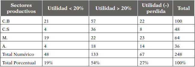 Según se evidencia en la Tabla 11, el 54% de los emprendimientos asesorados obtienen una utilidad mayor al 20% considerada aceptable, mientras que el 27% generan pérdida, y el 19% generan una utilidad menor al 20%, considerado como poco apreciable.