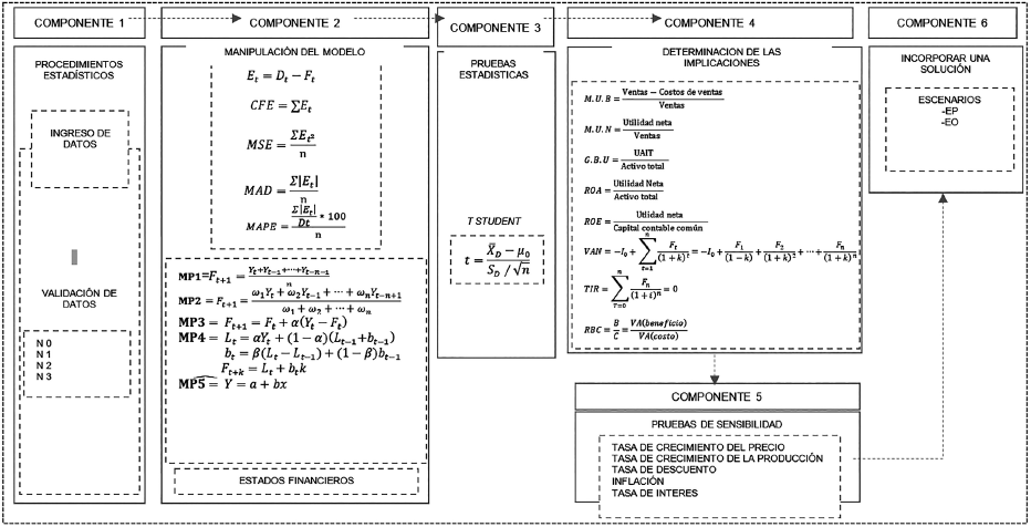 El modelo propuesto se denominará en lo sucesivo «MEED-JCES-2018». Dicho modelo abarcará los enfoques y aportaciones de diferentes autores, y se evidenciará con mayor énfasis métodos cuantitativos de pronósticos, específicamente los de series de tiempo. Adicional de aquello, se presentan parámetros financieros y estadísticos que permitirán medir con precisión la exactitud los pronósticos y el nivel de rentabilidad (ver Figura 2).