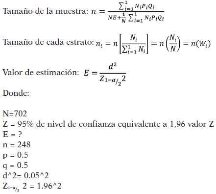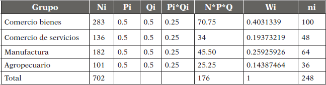 Según López (2014), para que una muestra sea representativa de su población debe contener al menos el 30% de la totalidad de casos. En este sentido se aclara que, de 702 emprendimientos que comprende la población mediante la aplicación del método estadístico de muestreo estratificado, se obtienen 248 observaciones como cálculo muestral, totalmente representativo de la población con más del 30% como establece el precitado autor (op. cit), por lo que queda evidenciado el cálculo de la muestra para el estudio presente.