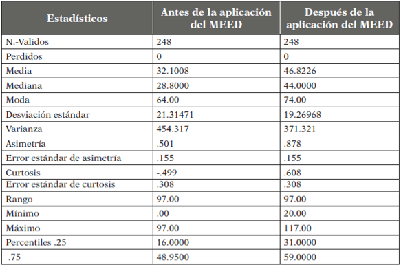 A continuación, como interpretación de los resultados finales, se presenta el análisis sobre el contraste de los elementos antes y después de la aplicación del «MEED-JCES-2018».