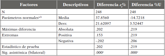 Se procede a realizar el ritual de significancia estadística para la selecciónde la prueba de hipótesis. Se aplica la prueba de Kolmogórov-Smirnov, para unamuestra sobre la variable diferencia (et% de error del pronóstico antes- et% despuésde la aplicación del MEED) y sobre la variable diferencia (% U modelo actual - % Umodelo propuesto), con el fin de comprobar si las variables de estudio se distribuyeno pertenecen a una distribución normal.